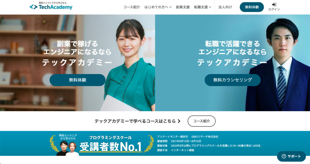無料カウンセリングは現在は無料体験も含んでいますので、TechAcademyと合わせて受講してみて、スキルアップについてバランスのとれた意見を集めるとよいでしょう。